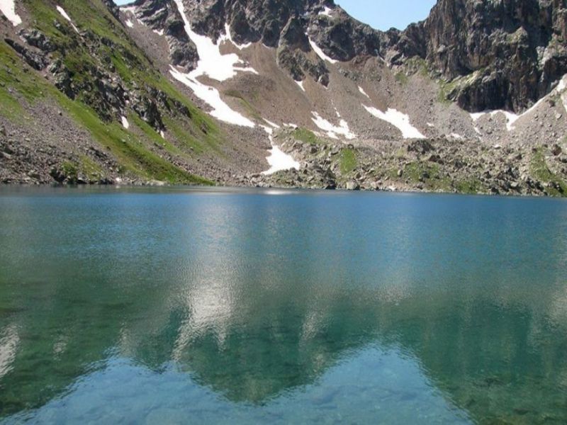 The Ai Köl lake is located on the northern slope of the Turkestan range, about 3000 meters above sea level. It is a small lake surrounded by large cliffs. One can observe its beauty only from afar.